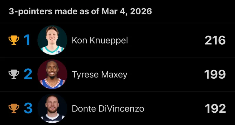 截至目前,本赛季克尼普尔命中216记三分,马克西命中199记三分,克尼普尔仍然是本赛季唯一一位三分球命中数超过200个的球员。