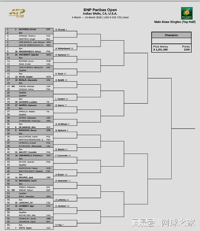 北京时间今晨,2026赛季ATP/WTA1000美国印第安维尔斯公开赛官宣了单打正赛签表。男子方面:世界前十悉数出战,前八大种子的对位如下:上半区,阿尔卡拉斯--德米纳尔、德约科维奇--弗里茨;下半区,穆塞蒂--兹维列夫、谢尔顿--辛纳。中国没有球员进入正赛签表,但有两位球员出战资格赛,他们是香港球员黄泽林和台湾球员曾俊欣。